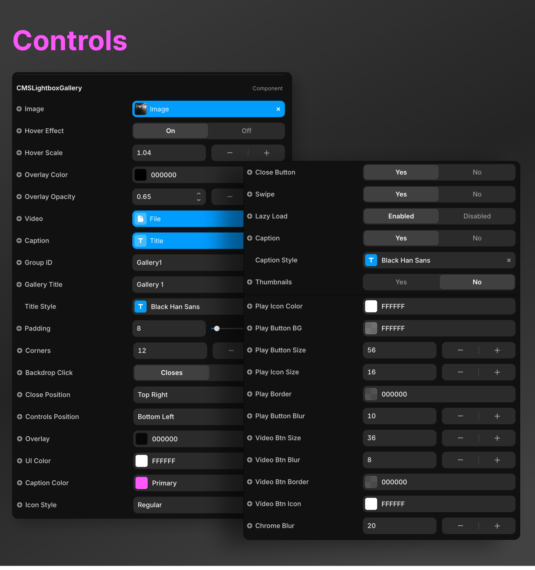 Connect your CMS fields for images, videos, captions, and titles. Items with the same Group ID are grouped into a single lightbox.